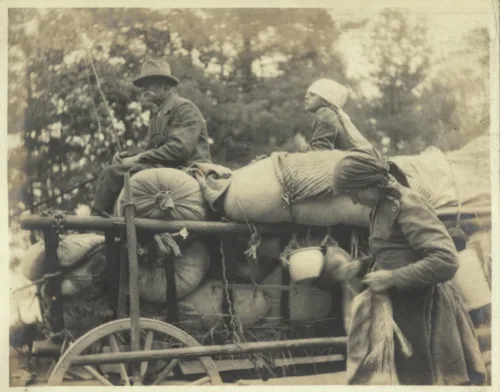 W 1915 roku armia rosyjska, cofając się pod naporem wroga, stosuje brutalną taktykę spalonej ziemi. Z opuszczanych terenów wypędza ludność, rabuje dobytek, niszczy zasiewy, wywozi żywność, bydło i konie – wszystko po to, by nadchodzący przeciwnik nie znalazł niczego, co mogłoby mu się przydać. Po wsiach krąży strach podsycany propagandą – „Niemiec będzie babom cycki […]